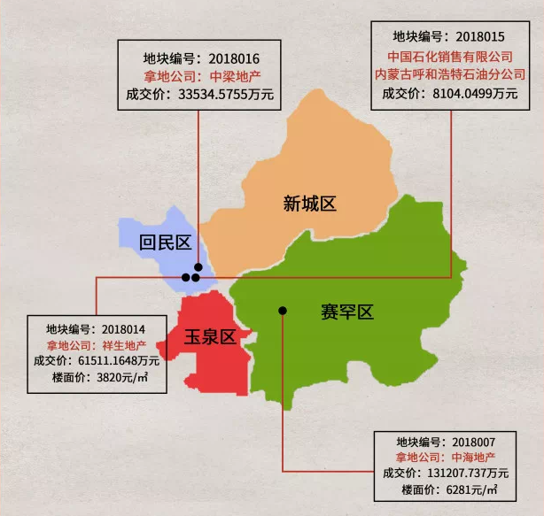 紧接着的7月2日,中海地产在呼和浩特市2018年第3次土地拍卖中,豪掷13.1亿元,竞得位于南二环与展东路交汇处东南角的2008007号宗地,成交单价创呼和浩特土拍之最,成为当年度的“地王”。