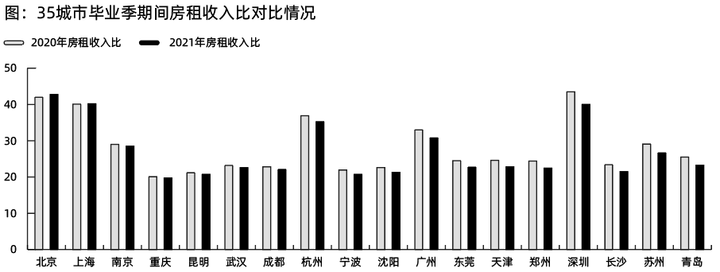 不过,抛开收入论租金并不科学,如果将毕业生薪酬纳入统计,北京、上海、深圳、杭州、珠海及广州等地租房压力较大,房租收入比不低于30%。按照城市级别看,一线城市房租收入比约为39.23%,新一线城市约为24.09%,二线城市约为22.58%。