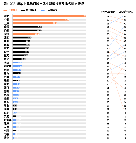 《洞察报告》显示,一线城市仍是毕业生的优选就业城市。不过,深圳的毕业生就业期望指数排名从2020年的第4位调整为2021年的第6位,主要原因之一就是居住负担相对较高。与此同时,新一线城市中成都排名涨幅最明显,取代武汉成为毕业生优选的就业城市。