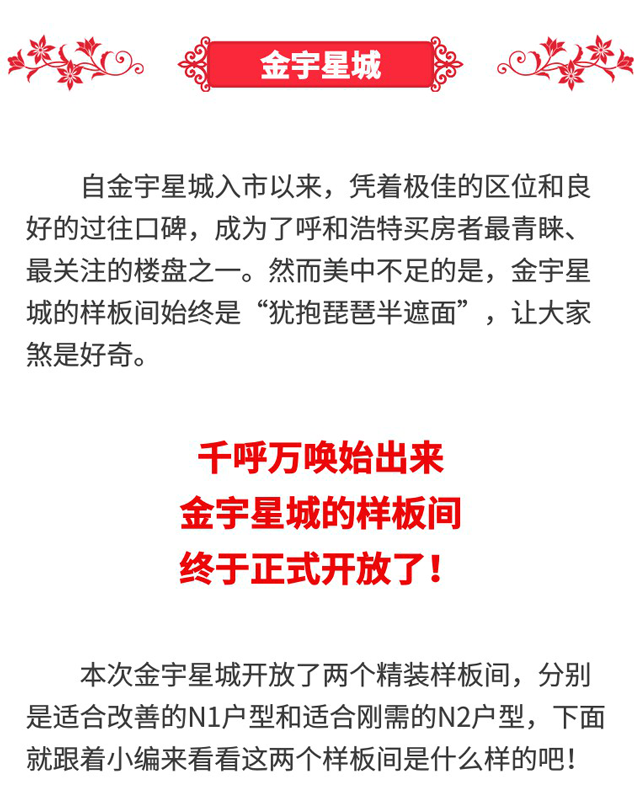 自金宇星城入市以来,凭着优质的区位和良好的过往口碑,成为了呼和浩特买房者最青睐、最关注的楼盘之一。千呼万唤始出来,金宇星城的样板间终于正式开放了!