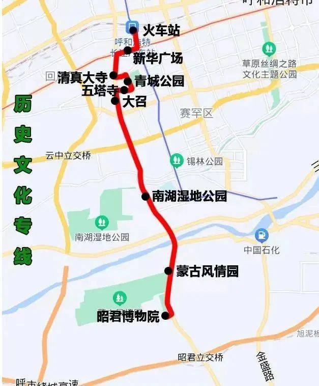 历史文化专线(火车站——昭君博物院)途经:锡林北路、新华大街、通道南路、中山西路、石羊桥路、大东街、大北街、大南街、昭君路,沿途设站:火车站、新华广场、清真大寺、青城公园、五塔寺、大召、南湖湿地公园、蒙古风情园、昭君博物院,单程:17.2公里,配车:8台。