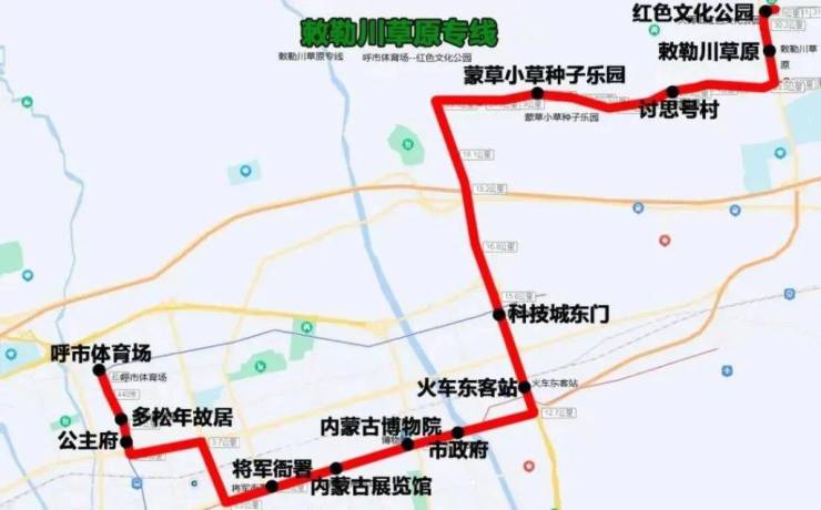 敕勒川草原专线(呼市体育场——红色文化公园)途经:气象局西巷、海拉尔西街、呼伦南路、新华大街、新华东街、科尔沁北路辅道、呼和塔拉西街、呼和塔拉东街、野马图、Y371,沿途设站:呼市体育场、多松年故居、公主府、将军衙署、内蒙古展览馆、内蒙古博物院、市政府、火车东客站、科技城东门、蒙草小草种子乐园、讨思号村、敕勒川草原、红色文化公园,单程:30.5公里,配车:8—10台。