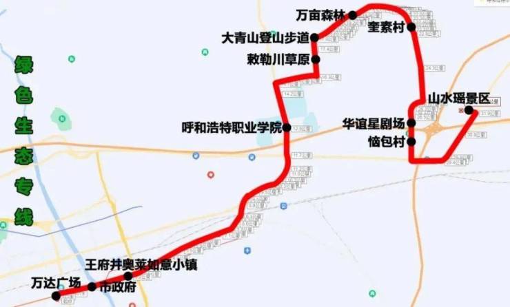 绿色生态专线(万达广场——山水瑶景区)途经:新华东街、机场路、S101、呼和塔拉东街、野马图路、Y371、恼包路、110国道、S105省道,沿途设站:万达广场、市政府、王府井奥莱如意小镇、呼和浩特职业学院、敕勒川草原、大青山登山步道、万亩森林、奎素村、华谊星剧场、恼包村、山水谣景区,单程:33公里,配车:8—10台。