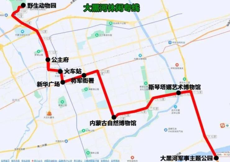 大黑河休闲专线(大青山野生动物园——大黑河军事主题公园),途经:Y317、通道北路、车站西街、锡林北路、新华大街、兴安南路、金桥路、大黑河北岸路,沿途设站:野生动物园、公主府、火车站、新华广场、将军衙署、内蒙古自然博物馆、斯琴塔娜艺术博物馆、大黑河军事主题公园,单程:30.7公里,配车:8—10台。