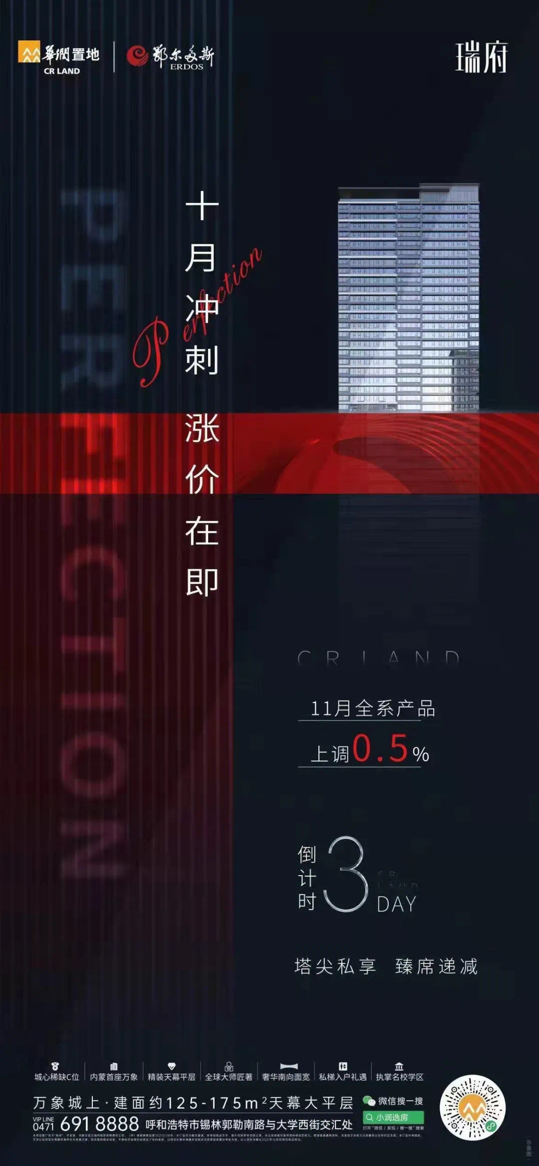 华润置地·瑞府今日发布消息,11月即将涨价,全系产品价格上调0.5%。上周华润置地与呼市四中正式签约,业主子女可入读四中老校区,过马路即到,随着学校配套到位,瑞府也成了呼市市中心全配套明星盘;根据血拼哥从项目处了解,原鄂尔多斯广场旧建筑即将拆除完毕,距离万象城建设更近一步了,相关工程实景,血拼团队将继续跟进和大家分享。