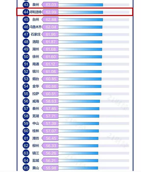 10月27日,第二届《中国潮经济·2021网红城市百强榜》发布,内蒙古有三地入选,分别为:呼和浩特(44 名)、鄂尔多斯(86名)、包头(93名)。呼和浩特以62.99的综合得分排名榜单第44名,是内蒙古少有进入榜单前50的城市。去年排名前列届评选,呼和浩特同样进入网红城市百强榜,得分51.31,排名为58,是内蒙古少有进入该榜单的城市。今年,呼和浩特比去年前进了14名,得分多了近12分。