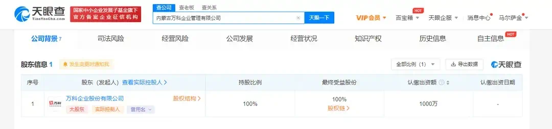 根据天眼查显示,7月7日,万科企业股份有限公司成立全资子公司内蒙古万科企业管理有限公司。工商信息显示,内蒙古万科法定代表人为李毅,注册资本1000万元,经营范围包括房地产开发经营;建筑材料销售;工艺美术品及礼仪用品销售(象牙及其制品除外)。