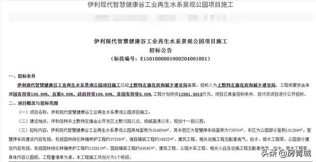 另外,园区内生态建设项目同样提上日程,将启动伊利现代智慧健康谷工业再生水系公园项目,公园整体规划用地264854㎡,总投资1.2亿元,建设地点位于金山开发区土默川路以北,绕城高速以东,包含有智慧停车场,园林绿化,道路铺装,公园水系等工程,整体工期预计287天,目前已经开启招标。
