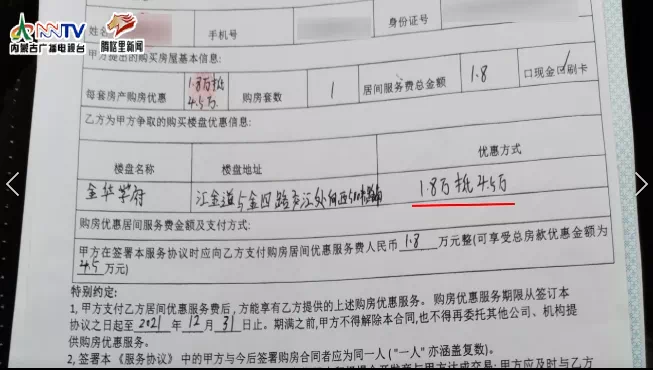 今年12月份,呼和浩特市土默特左旗金华学府小区的部分业主和记者反映,他们买房的时候在售楼部交了一万八千元和三万元不等的服务费,当时售楼部的工作人员表示,这笔钱可以抵四万五千元和六万元的购房款。结果业主拿到网签合同之后,发现自己交的服务费没有抵一分钱的购房款。