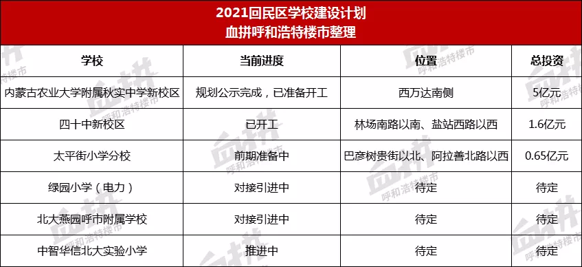 2021回民区学校建设计划 l 血拼哥特别制图目前秋实中学新校区已开工建设,选址于西万达南侧,未来将作为高中部使用;四十中新校区完成招标,进入施工阶段,包含初中部、高中部,未来将引入知名学校进行教学管理。