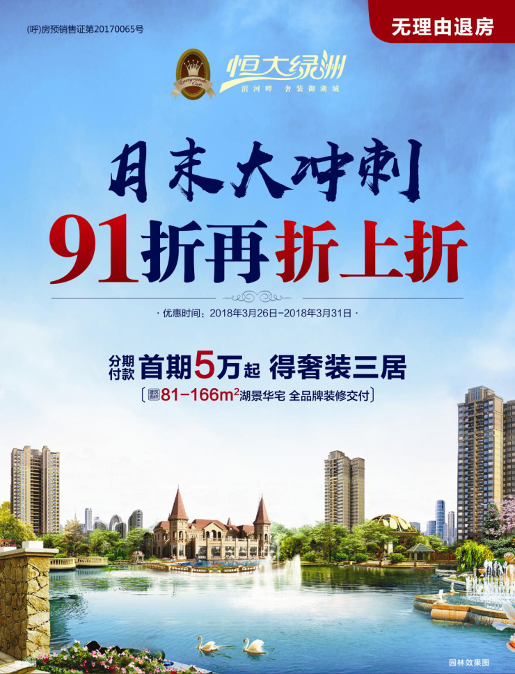 恒大绿洲月末大冲刺,91折再折上折!分期付款,首期仅5万起!96-111㎡河景楼王全城热销!15#独揽较佳湖景,109㎡国标户型,精致三居,优质生活!3月31日——4月1日恒大绿洲【舞动青城 最美绿洲】老年广场舞大赛,邀你共舞!3月27日-4月1日关注【恒大绿洲】微信公众号,领取免费电影票!