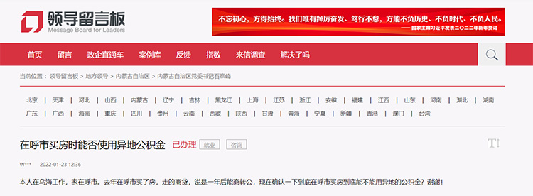 近日,人民网“领导留言板”有网友留言咨询外地工作的人在呼和浩特市买房,能不能用异地住房公积金的问题,得到了相关部门的积极回应。