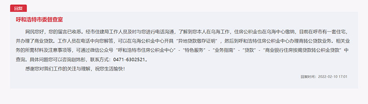 呼和浩特市委督查室进行了答复:网民您好,您的留言已收悉。经呼和浩特市住建局工作人员及时与您进行电话沟通,了解到您本人在乌海工作,住房公积金也在乌海中心缴纳,目前在呼和浩特市有一套住宅,并办理了商业贷款。工作人员在电话中向您解答,可以在乌海公积金中心开具“异地贷款缴存证明”,然后到呼和浩特住房公积金中心办理商转公贷款业务。相关业务的所需材料及注意事项等,可通过微信公众号“呼和浩特市住房公积金中心”-“特色服务”-“业务指南”-“贷款”-“商业银行住房按揭贷款转公积金贷款”中查询。