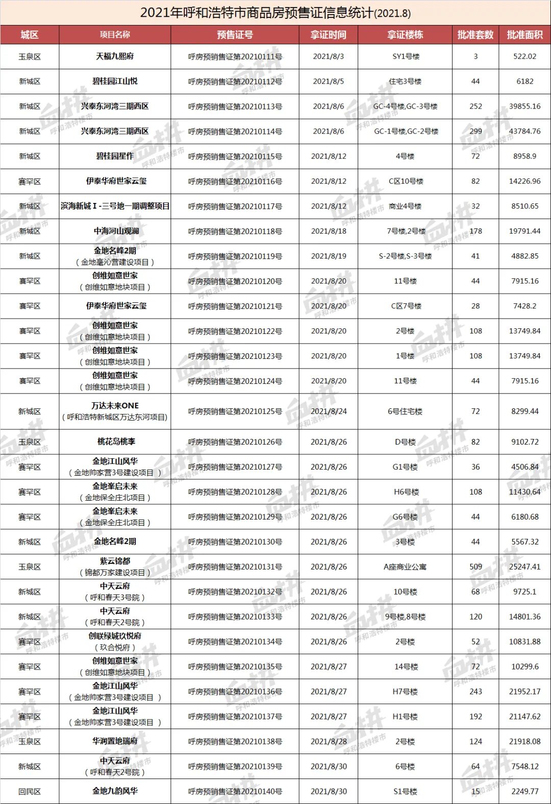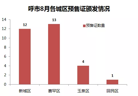 8月,呼和浩特共颁发30张预售证,3180套房源获批入市销售,其中赛罕区最多为13张,新城区次之,为12张,玉泉区4张,回民区1张。