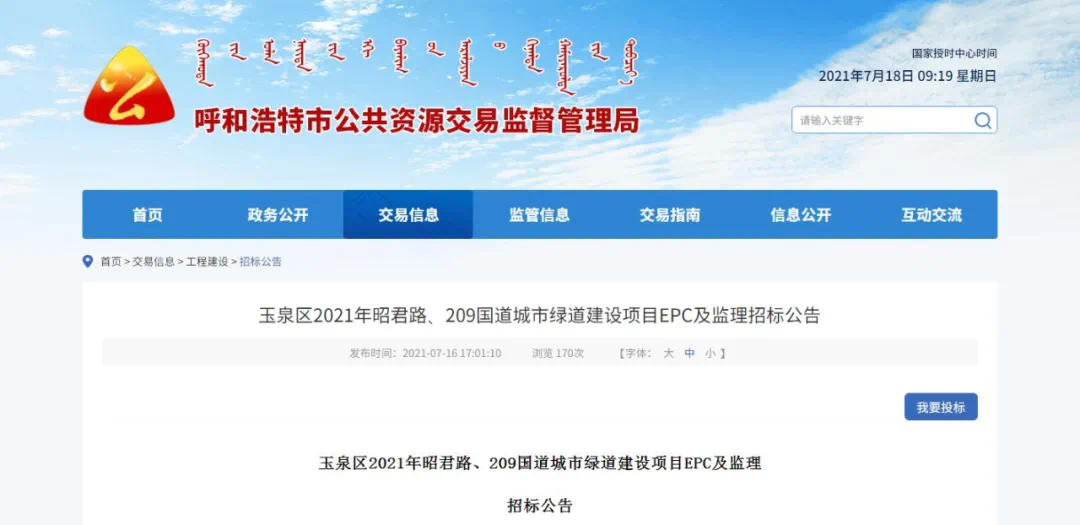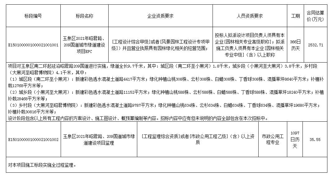 呼和浩特新闻网小编从呼和浩特市公共资源交易监督管理局了解到,玉泉区2021年昭君路、209国道城市绿道建设项目已经在呼和浩特市玉泉区住房和城乡建设局备案。招标人为呼和浩特市玉泉区住建局园林绿化管理所,工程所需资金来源国有投资100%,自筹0%,政府投资100%,非国有投资0%,工程计划投资2888.69万元。项目已具备招标条件,现对该项目进行公开招标。