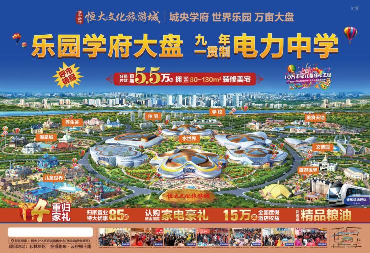 现呼和浩特恒大文化旅游城住宅臻藏组团正火爆销售中,全新住宅组团毗邻10万㎡儿童王国乐园,邻近约14万㎡的市政绿化公园(规划中),呼市四中(电力中学)已正式签约入驻,未来将引进全市优质高中,实现幼小初高15年优质教育体系,现首付分期首期5.5万起享80-130㎡乐园全装修美宅,认购还送价值20000元儿童梦幻城全年畅玩卡,畅玩呼和浩特网红打卡亲子遛娃胜地。
