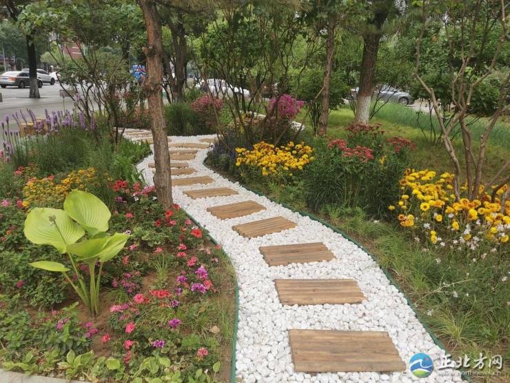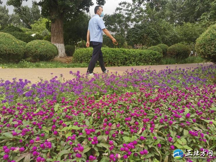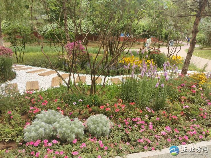 随后,记者来到兴安路与新华大街交会处东南角新华游园外缘,这里的美景吸引大量市民前来“遛娃”,不少老人提笼遛鸟,呈现一派鸟语花香。此处花镜由阿尔泰游乐园承建,总面积为150平米,分主次两个花镜。这里的花卉花期长、耐旱,所使用的草均为植株较高、观赏性强、易养护管理、适应本地气候的品种,大量休闲木凳都是利用废材修建,中间用白石子配废弃木修成小路,使游客身临其境,营造一个宁静、和谐令人感觉舒适愉快的环境,花卉植物色彩丰富,形态优美,既表现了植物个体生长的自然美,又展示了植物自然组合的群体美。
