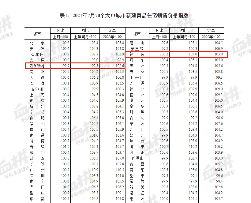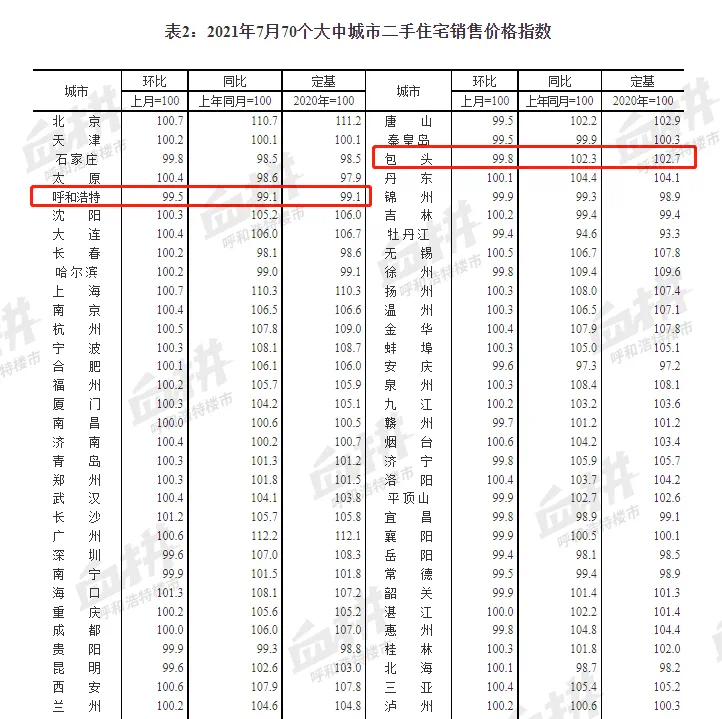 国家统计局公布7月全国70个大中城市房价指数,呼市新建商品住宅价格环比下降0.1%,同比上涨2.3%;二手房环比下跌0.5%,同比下跌0.9%,房价持续回落。