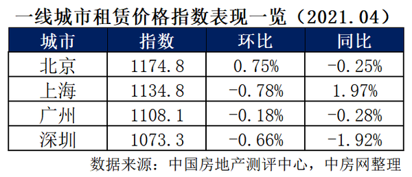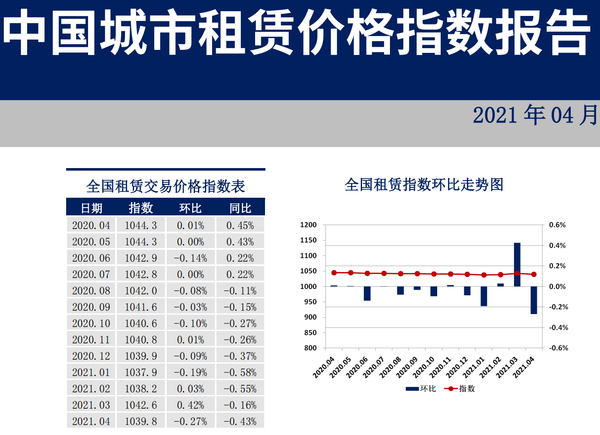 近日,由易居企业集团、上海易居房地产研究院中国房地产测评中心、华东师范大学东方房地产研究院三方共同发布的《中国城市住房租赁价格指数报告》显示,2021年4月份中国城市租赁价格指数为1039.8点,较上月下降2.8点,环比下跌0.27%,同比跌幅0.43%。