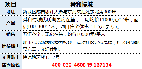 舜和慢城位于新城区成吉思汗大街与东河交汇处东北角500米处,是由天房控股开发的产品,天房伟业大家应该不陌生,发轫于呼市,目前在国内开发和规划的项目有舜和慢城、海东慢城、德州慢城、济南项目等,集团将运动健康生活理念与房地产业相结合,将品质生活理念传遍中国,目前舜和慢城 一期产品于今年四月份开始办理房本;二期优质湖景现房在售,面积100-300平米比较适合刚改型的购房者。