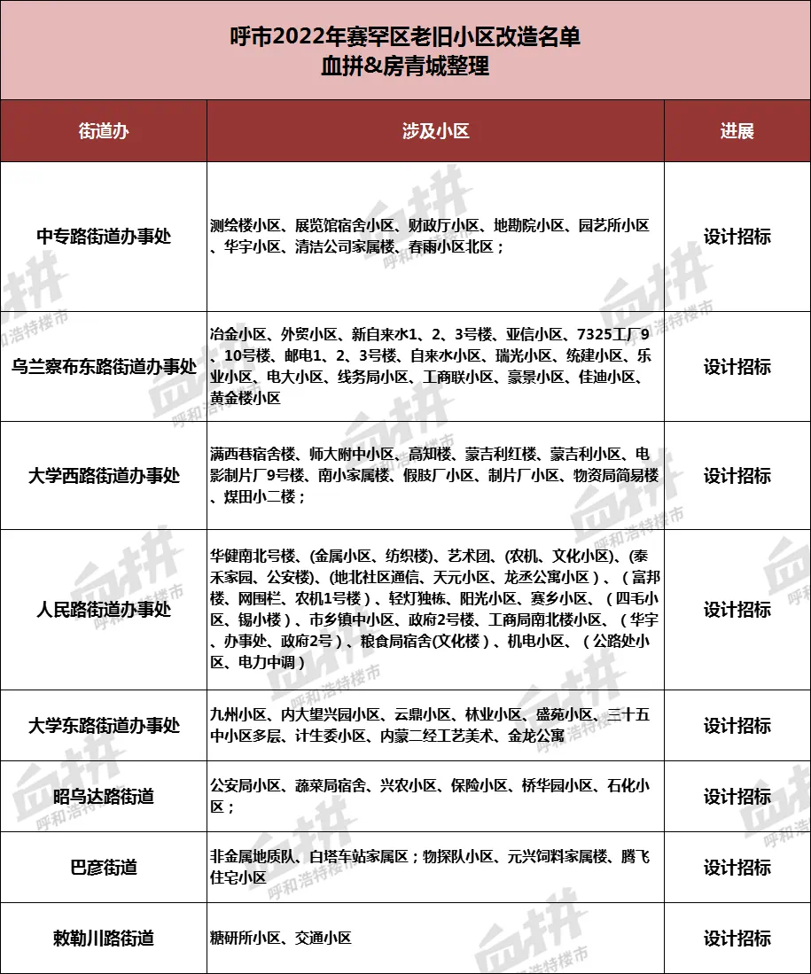 2022年,赛罕区将改造老旧小区75个,改造内容包括单元门,楼体标识,保温层,窗户,楼道楼梯等;小区内配套改造包括,供热管网改造、给水管网改造、排水管网改造、室外电网改造、安防改造、院面道路改造、围墙改造、绿化改造、便民设施改造等工程。目前75个改造小区设计项目已进行招标,招标完成后将逐步开启施工。
