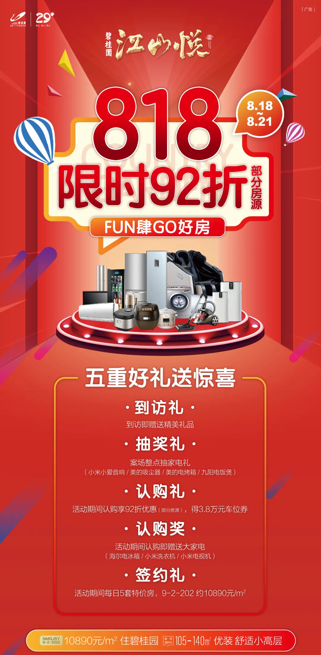碧桂园在新城区的第三个项目——碧桂园江山悦项目,推出8.18购房优惠,限时92折,送3.8万车位券,活动期间每日5套特价房,9-2-202售价只有10890元/㎡,远低于新城区均价,同时还有抽奖等。