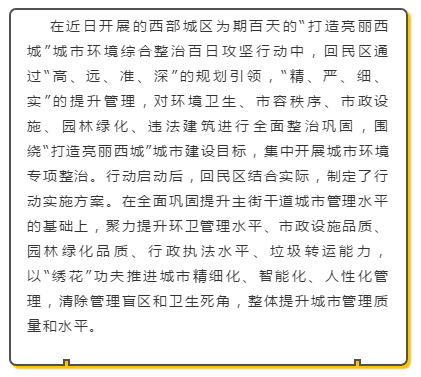 城中村及城郊接合部环境卫生一直是环境综合整治的重点难点,在此次西部城区环境综合整治百日攻坚行动中,回民区还重点加强了对城中村及城郊接合部环境卫生的整治力度。在整治中,对接管的城中村纳入环卫作业城乡一体化管理,配齐作业人员、设备、机具,落实各项作业要求及管理制度;彻底清理城中村及周边的积存垃圾及卫生死角,设立专门的污水收集井和污水收集车,杜绝发生污水乱倒现象;进一步梳理排查辖区范围内未列入今年改造计划的现存旱厕,制定改造升级计划,确需立即设置的地段安装环保公厕;全面整修、改造各城中村、城边村现有垃圾池等环卫设施,保证设施的正常使用。同时,增配必要的密闭垃圾收集设施、垃圾车以及环卫保洁人员,建立环境卫生作业及管理工作制度。