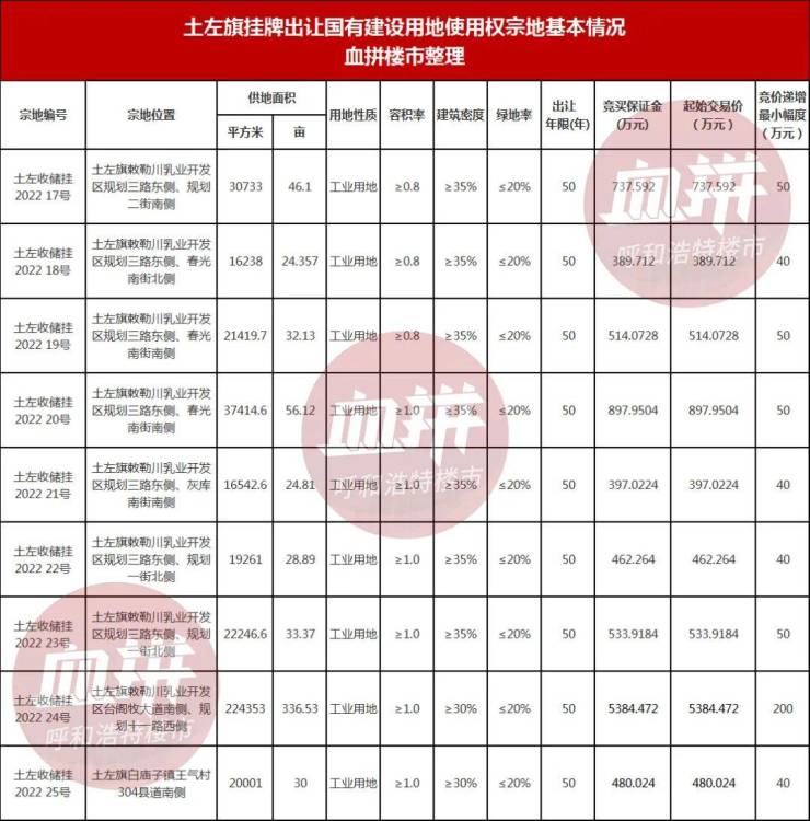 根据消息,土左旗将公开出让9宗土地,均为工业用地,出让年限50年,合计出让面积612.307亩,起始交易价总计9797.028万元;
