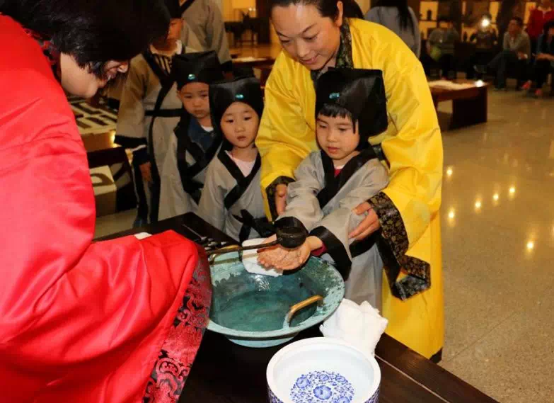 水至清至洁,象征着干净,纯洁。净手礼的寓意为净手净心,去杂取精,学生们将手放在水盆里,正反各洗一次,然后擦干。洗手的寓意在于洗手静心,希望孩子们能在日后的学习中心无旁骛。