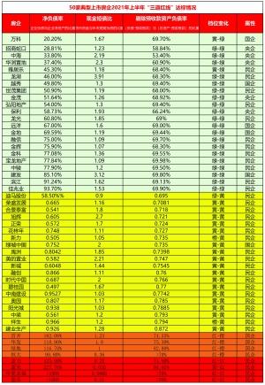 为此,我们结合50家典型房企的中报及公布数据进行计算,将2021年三道红线达标情况按照四档标准及净负债率从低到高形成表格(见右图)。统计显示,只有22家暂时拿着“绿色健康码”,在这22家绿档企业中,华润、中海、万科等一些有实力的房企依然坚挺,负债率降到很安全的范围。