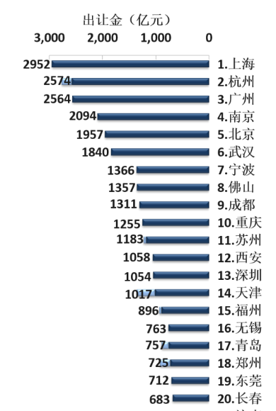 中指研究院数据显示,2020年全国300城市土地出让金总额达59827亿元,同比增加16%,再创新高。一线城市土地供需两旺,揽金总额同比上涨逾四成,北上广深收金同比均上涨;二线城市供求同比小幅上涨,楼面均价基本持平。值得一提的是,出让金榜单收金水平同比上行,排名前十的城市年度土地出让金额均突破千亿元,其中上海以2952亿元位列榜首。