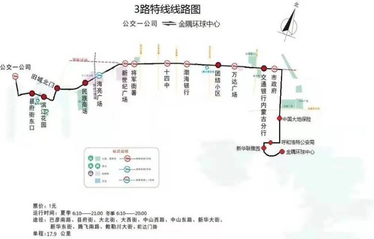 途 经:巴彦南路、县府街、大北街、大西街、中山西路、中山东路、新华大街、新华东街、腾飞南路、敕勒川大街、前达门路、腾飞南路