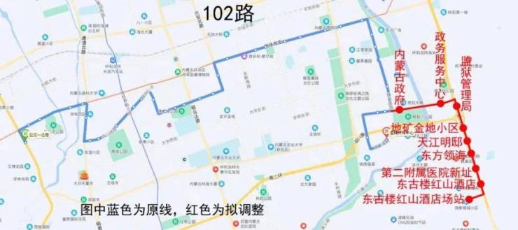 102路调整方案为:102路延伸至东古楼红山酒店场站发车,由保全街左转至科尔沁快速路辅道,直行到敕勒川大街,后拐入腾飞南路恢复原线。